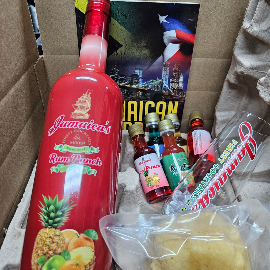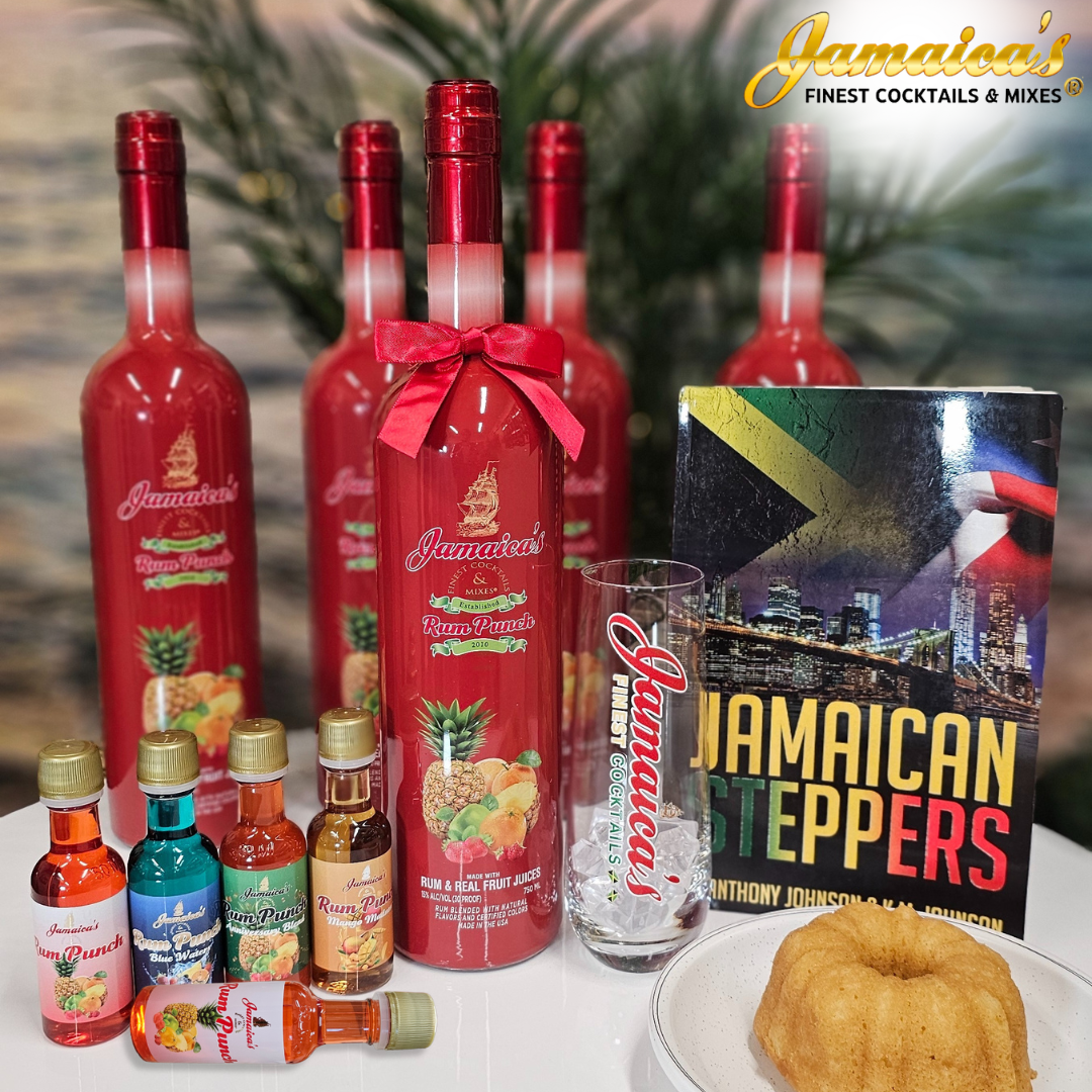 Each Gift Set contains: Rum Punch - 750ml, *Rum Cake - 3", Rum Punch Shot/Mini Party Pack, Stemless Logo Drinking glass, and Jamaican Steppers book. Yeah Mon!