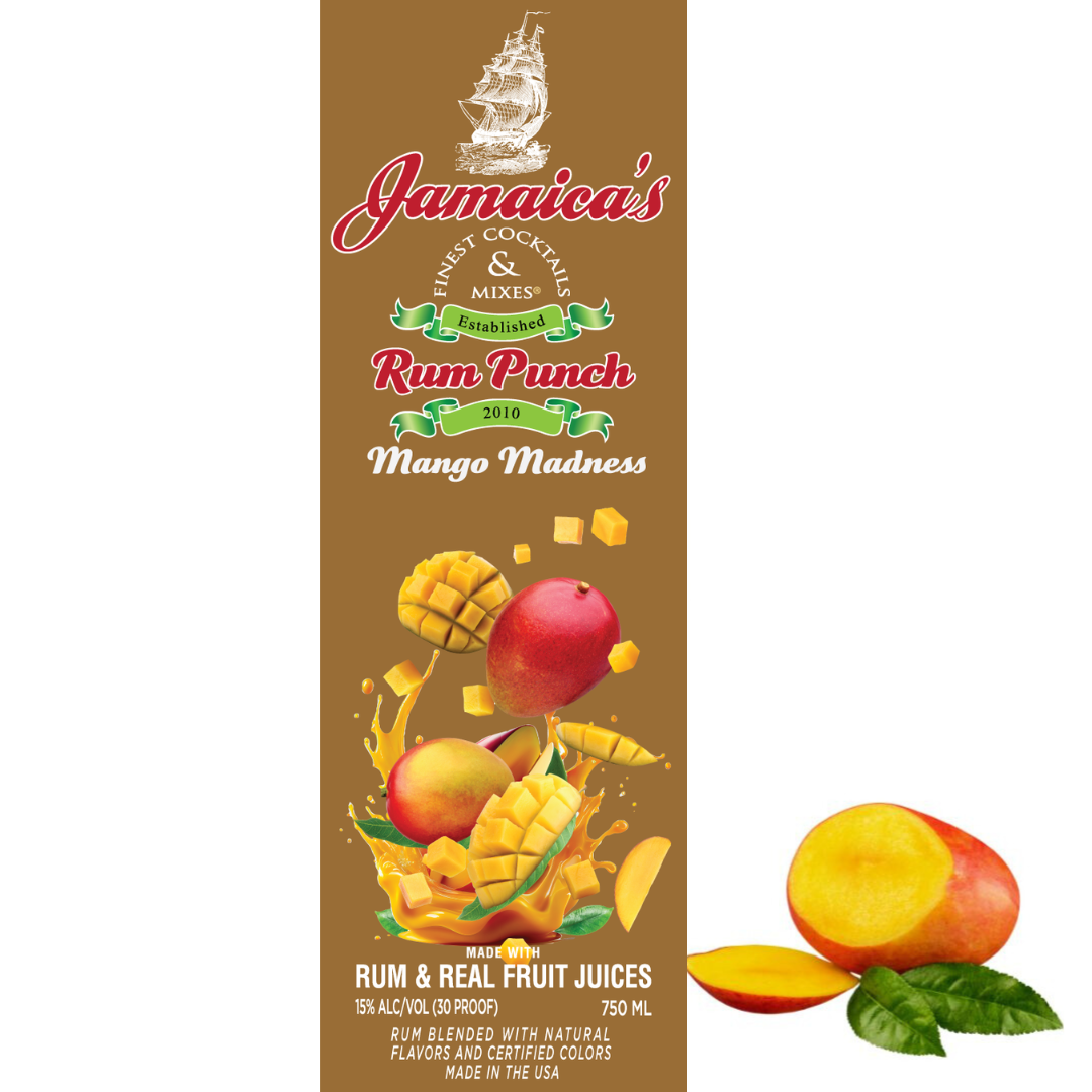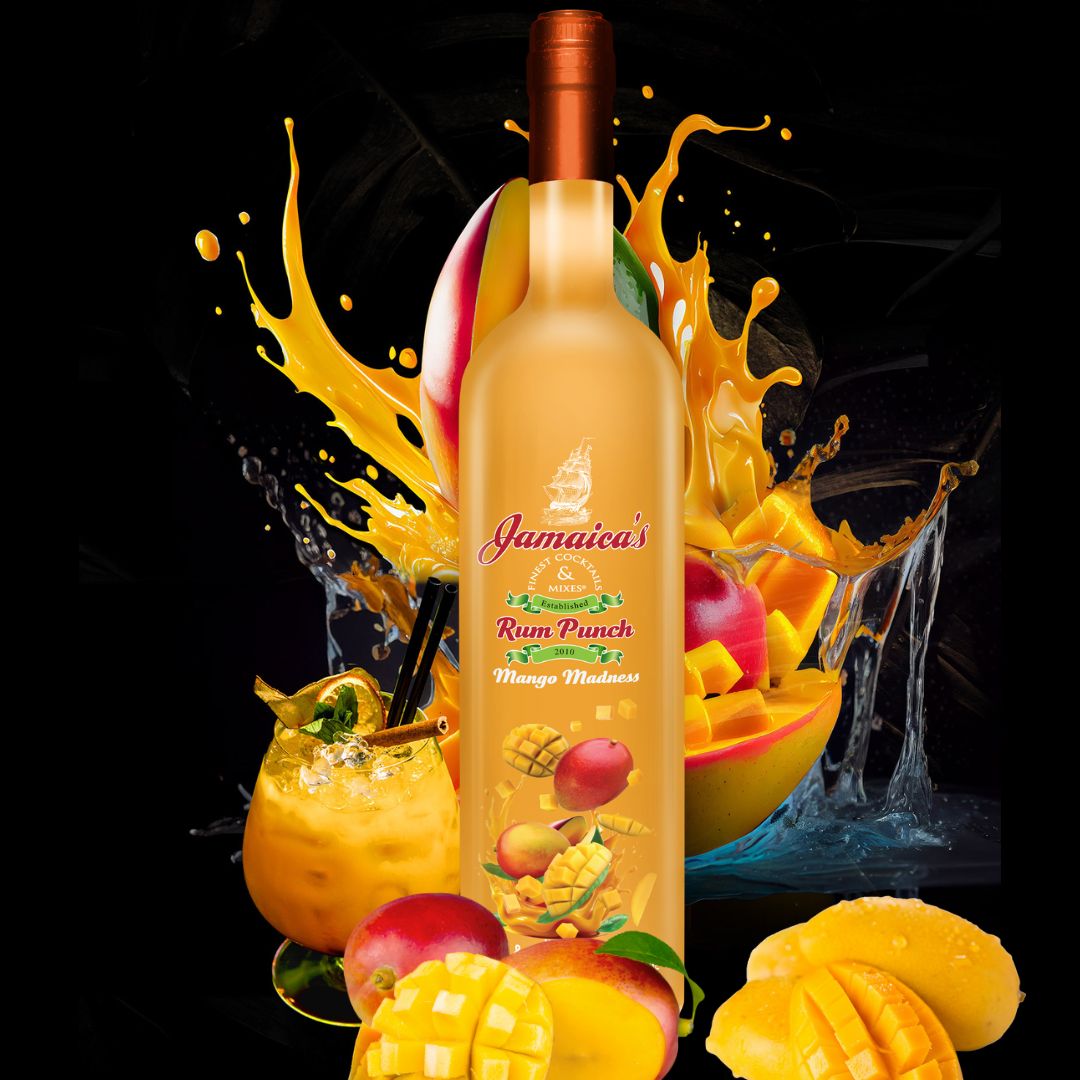 Our premium authentic Mango Madness Swirl Jamaican Rum Punch is made with REAL Mangoes and other fruit juices, Jamaican spices, premium Jamaican Rum, etc..